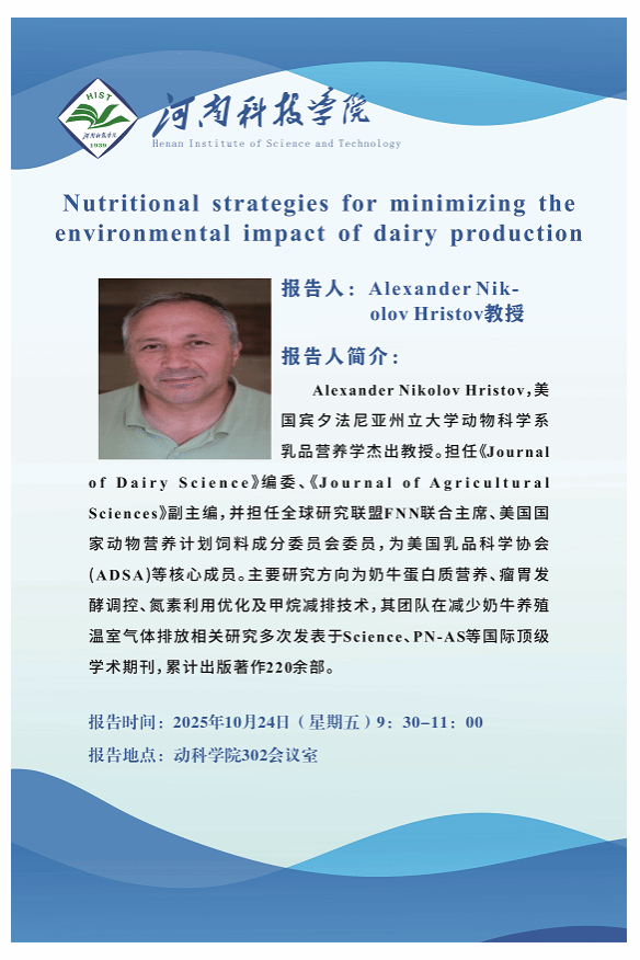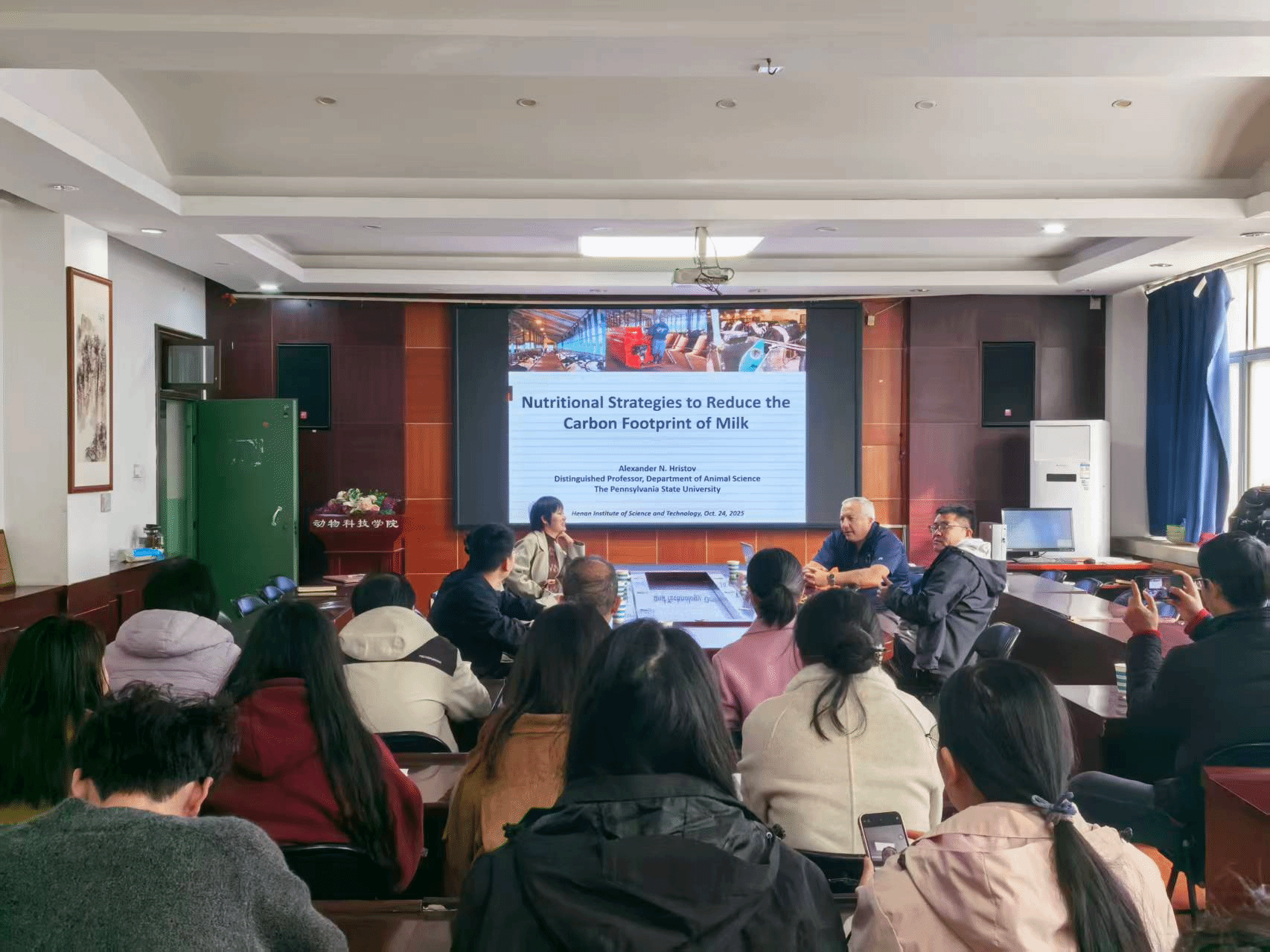 为促进国际学术交流,拓展师生科研视野,2025年10月24日上午,美国宾夕法尼亚州立大学动物科学系乳品营养学杰出教授Alexander Nikolov Hristo应我院滕战伟副教授邀请,莅临我校动物科技学院进行访问交流。交流活动在学院302会议室举行,由我院副院长贺永惠教授主持,动物科技学院部分青年教师及研究生共同参加了此次学术活动。