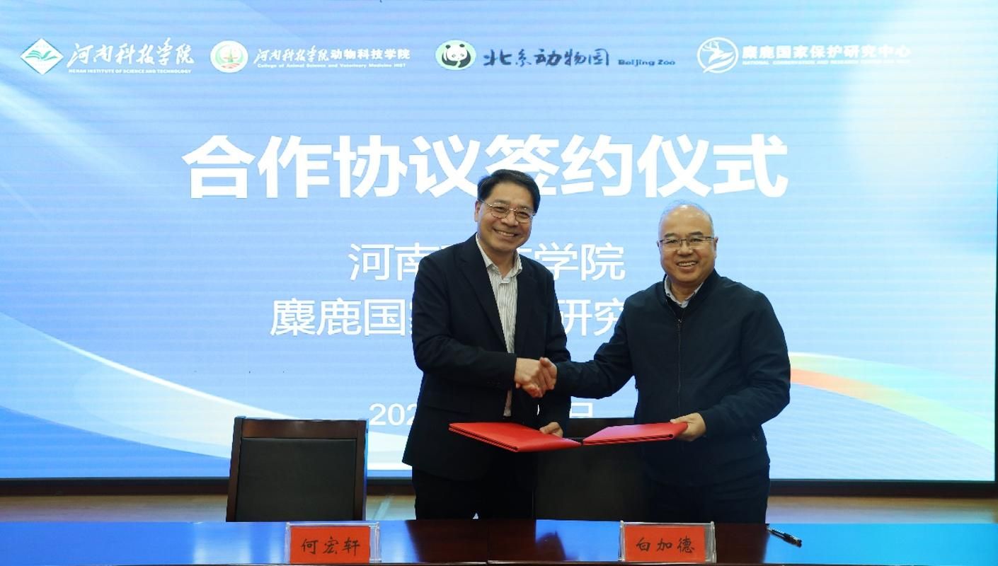 签约仪式由大会组委会张慧辉主任主持。麋鹿国家保护研究中心主任、研究员白加德,研究中心郭青云研究员、张庆勋研究员,北京动物园贾婷教授,中国科学院动物研究所韩姝伊研究员等知名专家,以及我校丁轲副校长、动物科技学院何宏轩院长共同出席并见证了此次签约。与会同仁一同见证了这一重要时刻。
