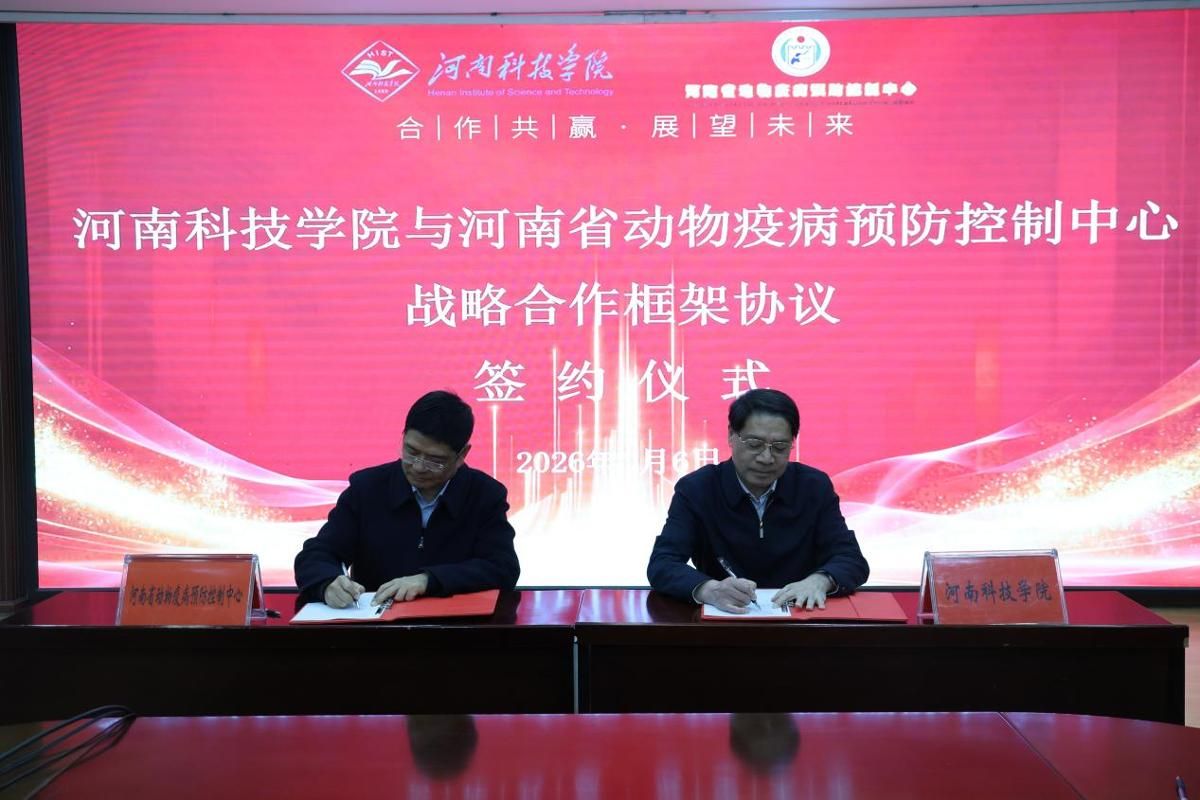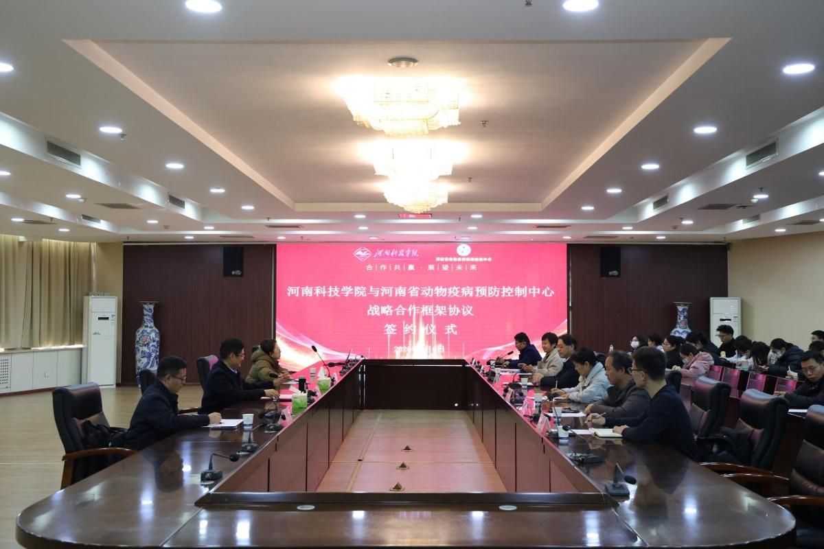 2026年1月6日下午,河南科技学院与河南省动物疫病预防控制中心在学院行政楼206会议室成功举行战略合作框架协议签约仪式。仪式由动物科技学院(野生动物保护学院)副院长贺永惠主持,校成果转化与合作办公室主任张慧辉、动物科技学院院长何宏轩、书记胡付广等,与河南省动物疫病预防控制中心主任闫若潜、技术研究室主任马震原、办公室主任郭育培等双方代表共同出席了此次活动。