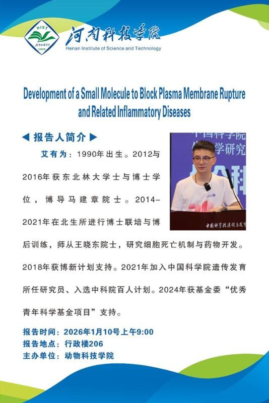 2026年1月10日上午,河南科技学院动物科技学院2026年度学术年会在行政楼206会议室成功举行。本次年会特邀中国科学院遗传发育所研究员、基金委优秀青年科学基金项目获得者艾有为博士作题为《Development of a Small Molecule to Block Plasma Membrane Rupture and Related Inflammatory Diseases》的专题学术报告。贺永惠副院长主持会议,学院领导、全体教师及研究生代表共计100余人参加了此次报告会。