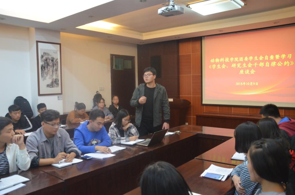 近期,某些高校内反映出来的学生组织和干部存在功利化、庸俗化问题,受到社会的广泛关注。为进一步加强我院团委学生会以及全体学生干部队伍精神文明建设,更好地发挥学生干部在广大青年学生中的先锋模范作用,动物科技学院团委学生会于10月9日晚举行学习《学生会、研究生会干部自律公约》座谈会。团委学生会主席团成员、部长以及各班代表参加会议。
