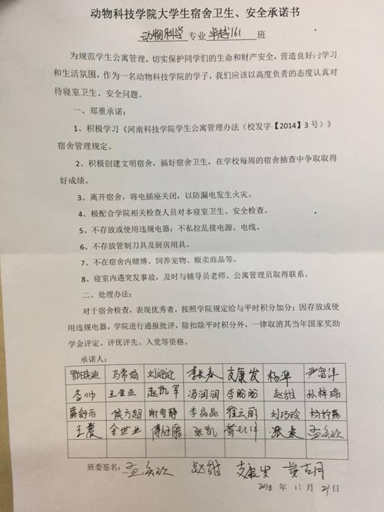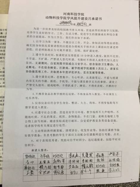 班会上,高老师结合上周班级学风督查情况,对存在问题的学生及宿舍进行了批评教育。之后向全班同学强调课堂纪律及宿舍卫生安全的相关事项,考勤方面做到“三不”:不迟到、不早退、不旷课;上课过程做到“四不”:不睡觉、不随意说话、不玩手机,不携带吃的东西进入教室;宿舍时刻保持卫生状态,做到人走断电,杜绝使用存放大功率电器。最后全班同学在宿舍安全承诺书及学风提升承诺书签字。