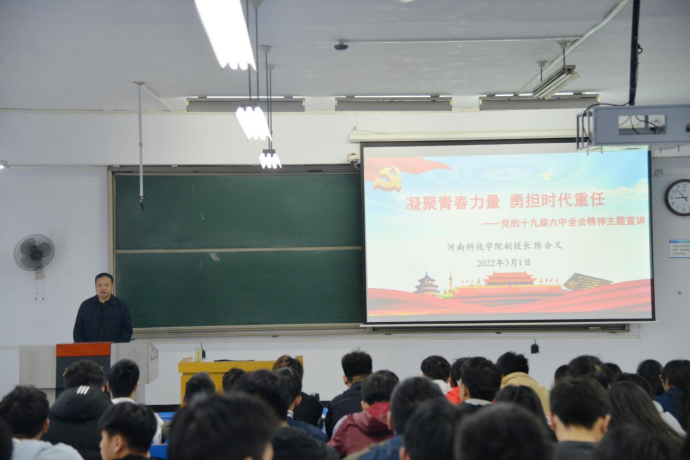 陈合义以《凝聚青春力量 勇担时代重任 》为题,紧紧围绕十九届六中全会,从重大决议的主要内容、特色亮点,以及青年学生如何学习践行三个方面,对十九届六中全会精神进行了深入解读。期间,他还以在疫情期间学校涌现出来的杰出青年师生为例,砥砺同学们要立大志、明大德、成大才、担大任,做中华民族实现伟大复兴的践行者、见证者,在建设社会主义现代化强国,实现中华民族伟大复兴的伟业中贡献青春力量。