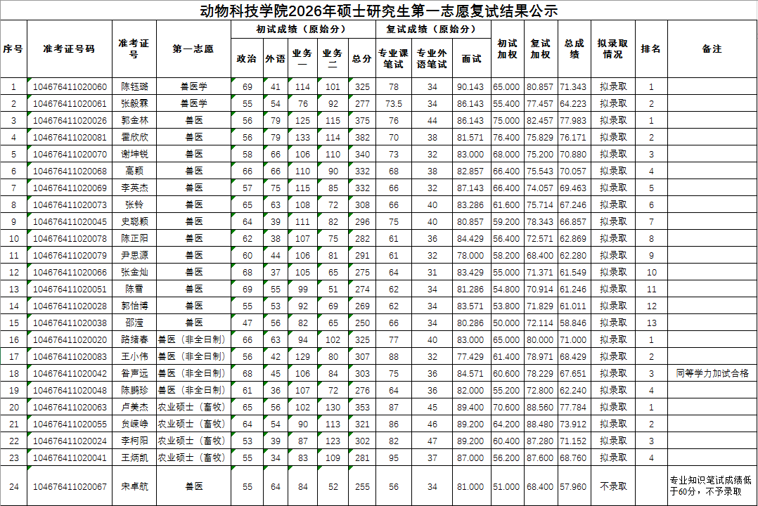 动物科技学院2026年硕士研究生第一志愿复试结果公示
