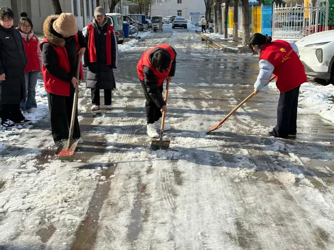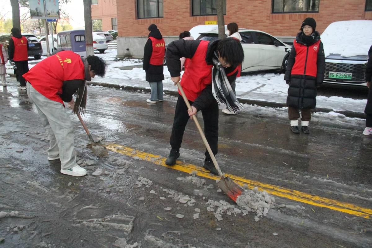 清扫现场,同学们手持铁锹、扫帚等工具,分工协作,默契配合,重点对教学楼、宿舍周边及主要通行道路的积雪和暗冰进行了集中清理。尽管天气寒冷,但大家干劲十足,劳动热情高涨,忙碌的身影构成了冬日校园里一道亮丽的风景线。
